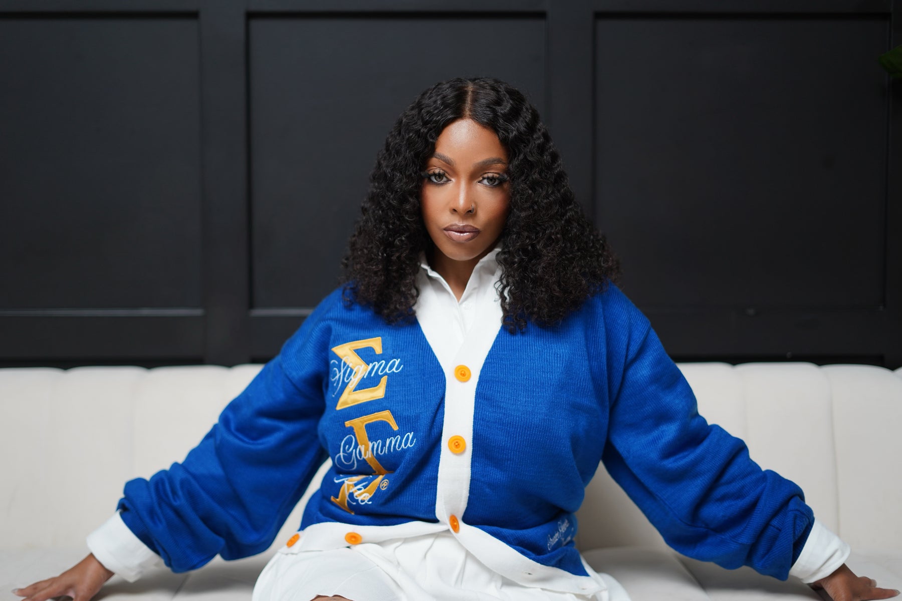 This RHOYAL BLUE cardigan exudes preppy sophistication, featuring , gold buttons, and bold white letters spelling "Sigma Gamma Rho" with elegant white embroidery. Perfectly polished, it’s a chic nod to sorority pride.